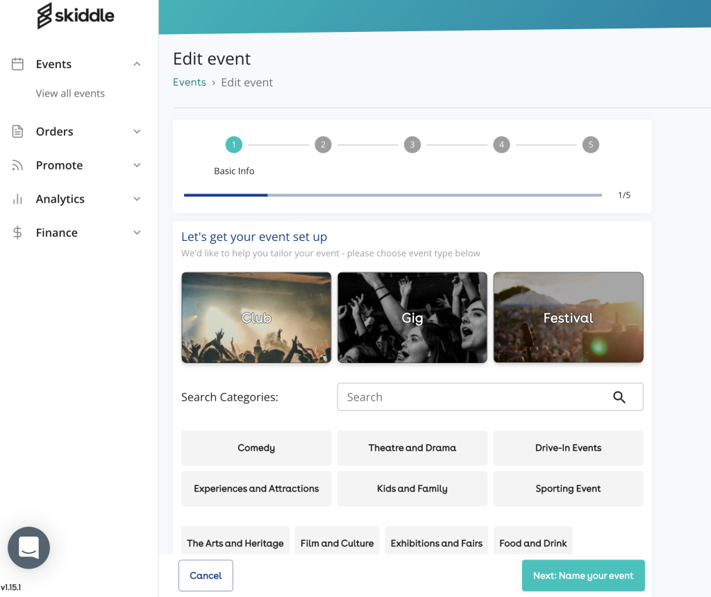 Pretty self-explanatory. Firstly, select ‘Create new event’ in the teal coloured box and then choose your category. There are a number of categories to choose from in our promotion centre – from ‘gig’, ‘club’ and ‘festival’ to ‘comedy’, ‘theatre’, ‘food’ and more. Choose the one that’s the most applicable to your event, click ‘Next’ in the bottom right-hand corner and give your event a name.