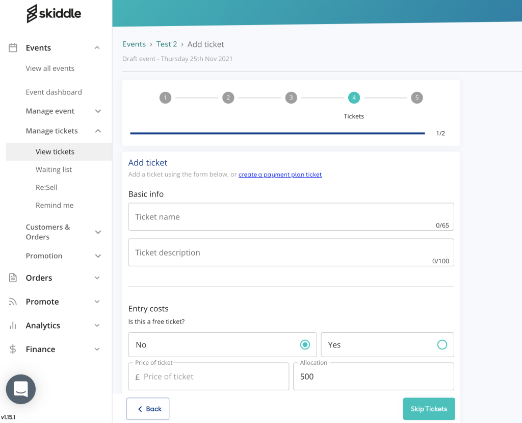Another pretty self-explanatory step. Here you can add the name of your ticket, ticket allocation, the entry cost and the date on which the ticket will go on sale. You can even create a payment plan to help your customers spread the cost of your ticket price should you so wish. There is also a range of advanced options which, for example, will allow you to show customers how many tickets you have left on sale.