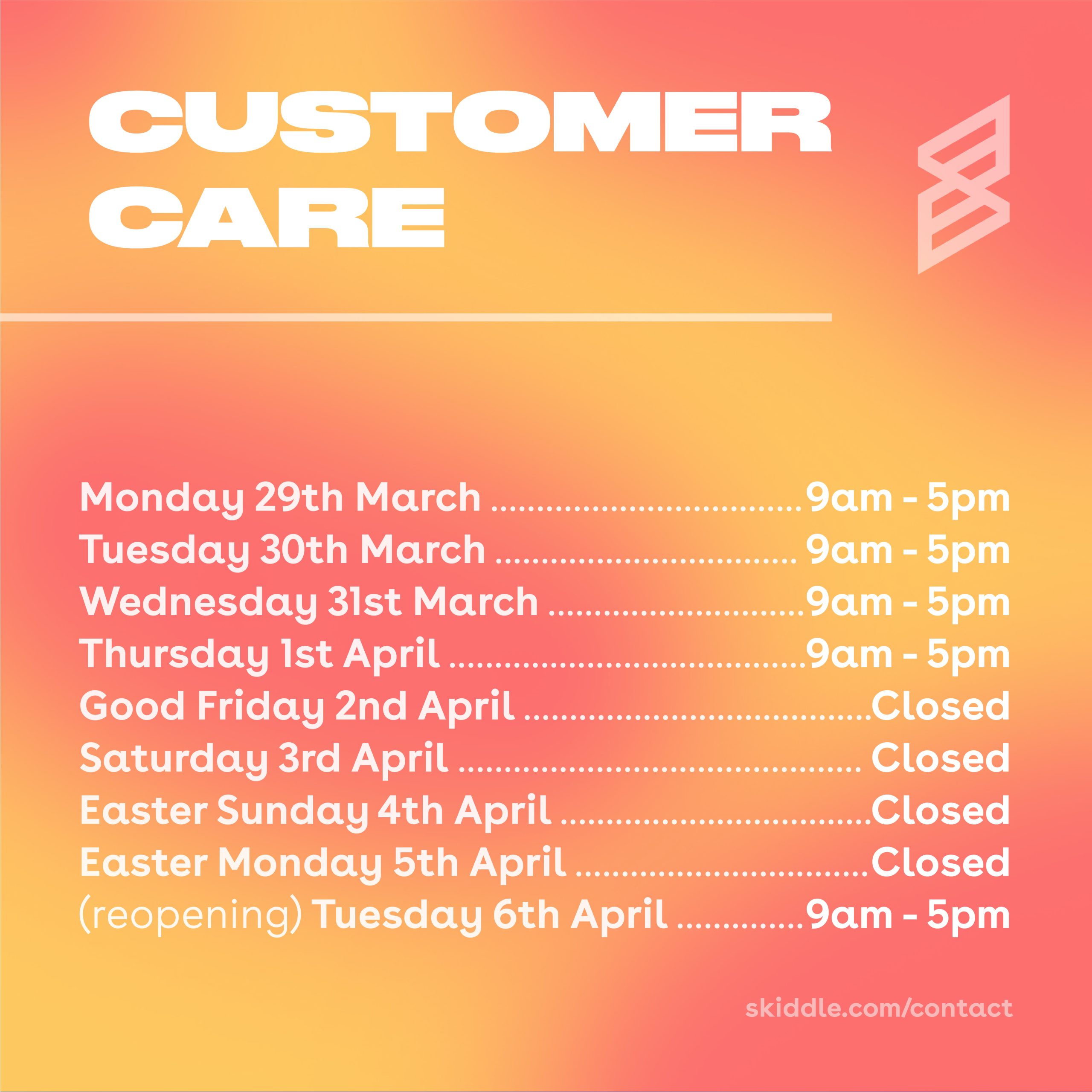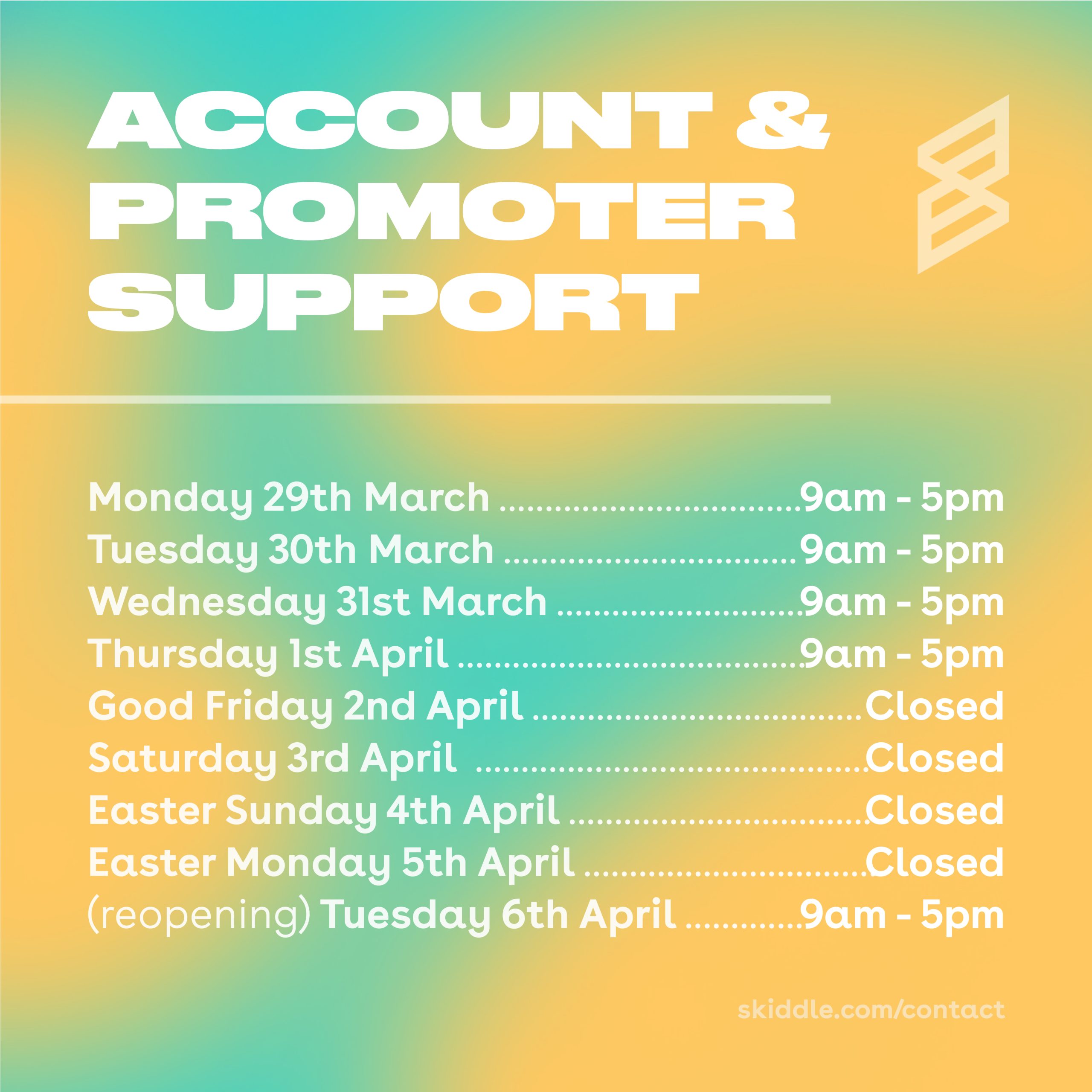 Giving our staff a well deserved break, Skiddle will be closed over Easter. But don’t worry, we’ve got your back as most general enquiries, be it promoter or customer related, can be actioned via your accounts.