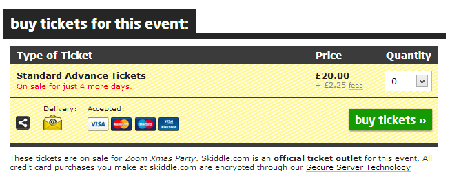 A booking fee is added per ticket. This is the margin that Skiddle take to cover the cost of providing the secure ticketing service, as in the vast majority of sales, we pass the full face value of the ticket to the event promoter. This covers debit/credit card processing fees, VAT, customer services, call handling, account management, our secure server costs and profit. We try to keep these costs to an absolute minimum. In some circumstances, a portion of this booking fee may also be paid to the event promoter. On our average ticket purchase, the consumer will pay no more than £1 or £2 to Skiddle for our service. Without the booking fee there would be no Skiddle.